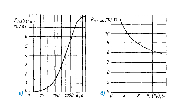 ![]() а) — переходное тепловое сопротивление контактная поверхность охладителя - охлаждающая среда при естественном охлаждении и рассеиваемой мощности 9,1 Вт |