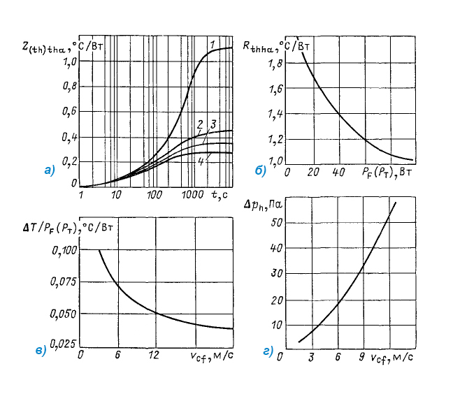 ![]() а) — переходное тепловое сопротивление контактная поверхность охладителя - охлаждающая среда (1-0 м/с (70 Вт); 2-3 м/с; 3-6 м/с; 4-12 м/с) |