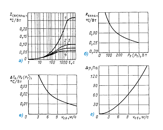 ![]() а) — переходное тепловое сопротивление контактная поверхность охладителя - охлаждающая среда (1-0 м/с (220 Вт); 2-3 м/с; 3-6 м/с; 4-12 м/с) |