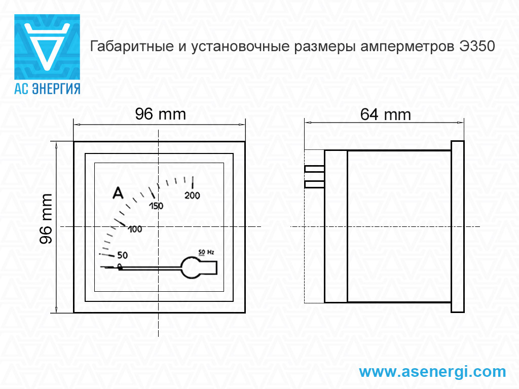 Размер корпуса амперметра 96х96 мм. Глубина 64 мм. Прибор монтируется в вертикальном положении.