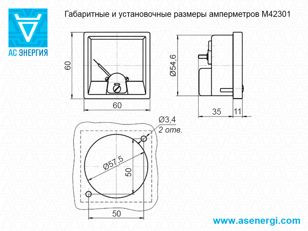 Габаритные размеры амперметров: 60х60х46 мм. Устанавливаются в вырез на панель – Ø57,5 мм; присоединительные размеры: 50х50 мм, 2 отв. Ø3,4.