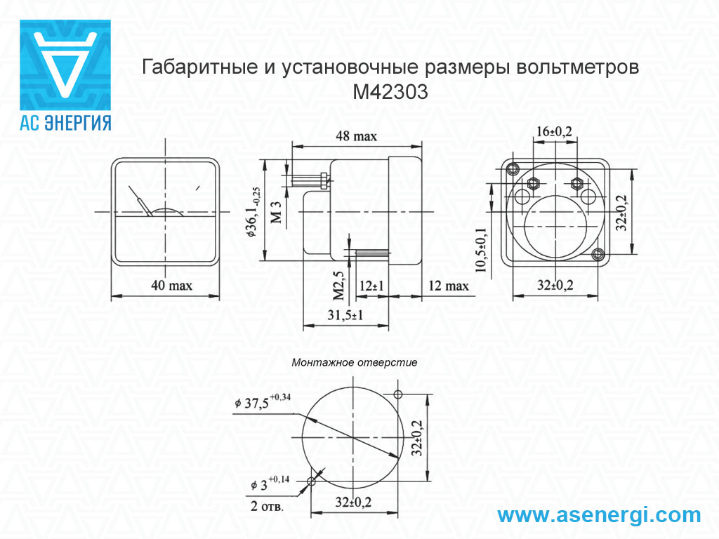 Стрелочный вольтметр М42303 предназначен для монтажа на вертикальных и горизонтальных панелях (щитах). Материал щитов может быть как магнитный, так и немагнитный. Для установки вольтметра необходимо отверстие диаметром Ø37,5 мм. Щитовой вольтметр крепится двумя винтами, расположенными с задней части прибора. Лицевая панель М42303 имеет квадратную форму со сторонами 40х40 мм.