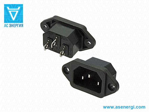Коннектор серии IEC 320 имеет 3 контакта. Тип корпуса разъема С14: блочный – для монтажа на панель.