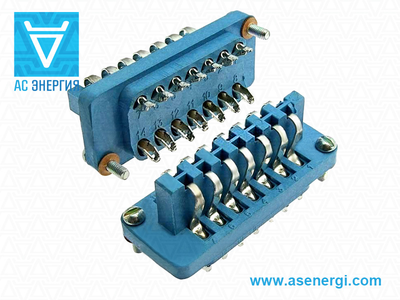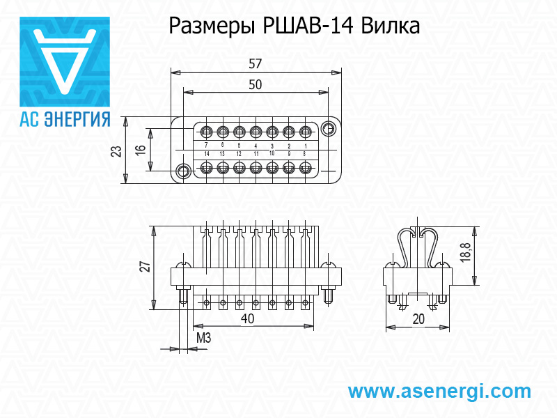 Разъем РШАВ-14 – 14-ти контактная вилка без корпуса. Разъем имеет габаритные размеры: 57×23×27 мм. Рабочая токовая нагрузка на каждый контакт – до 6 А, на соединитель в целом – до 84 А при напряжении до 700 В. Предназначен для работы в электрических цепях постоянного, переменного (частотой до 3 МГц) и импульсного тока.