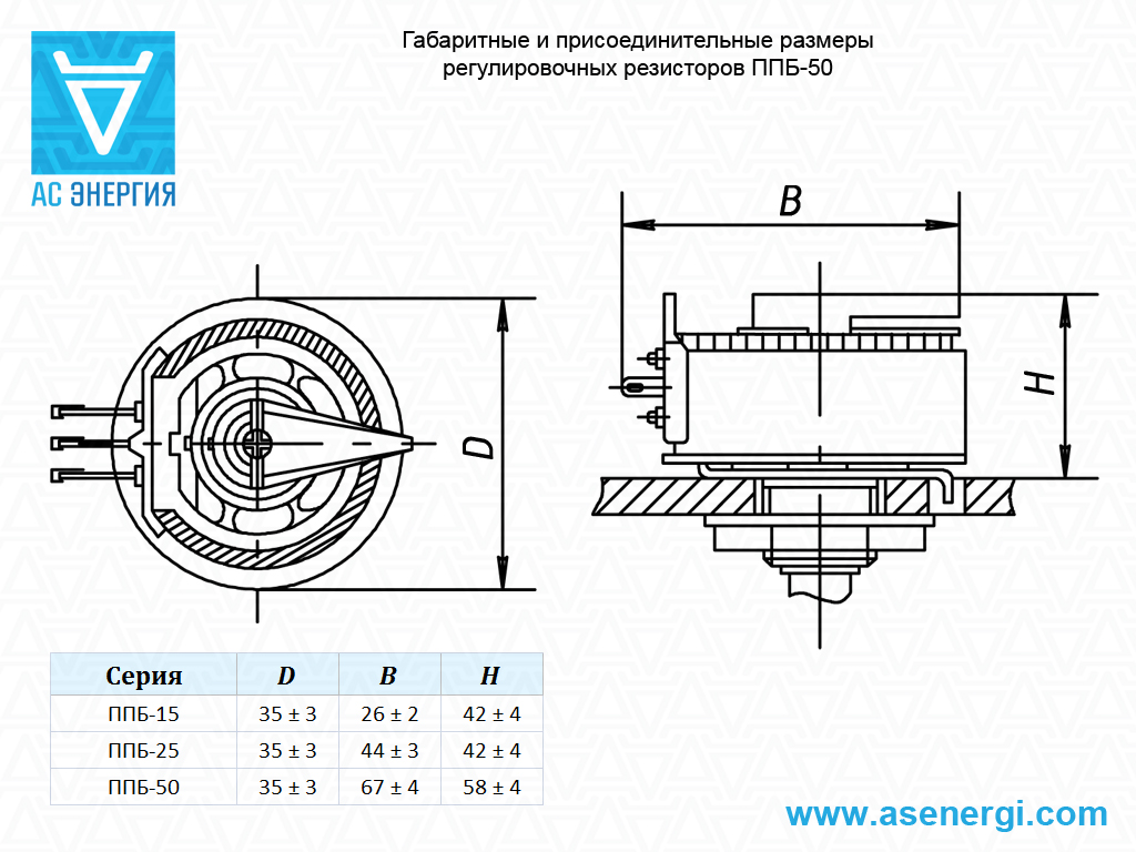 Дополнительные характеристики, а также габаритные и присоединительные размеры резисторов ППБ-1, ППБ-2, ППБ-3, ППБ-15, ППБ-25, ППБ-50 приведены ниже.