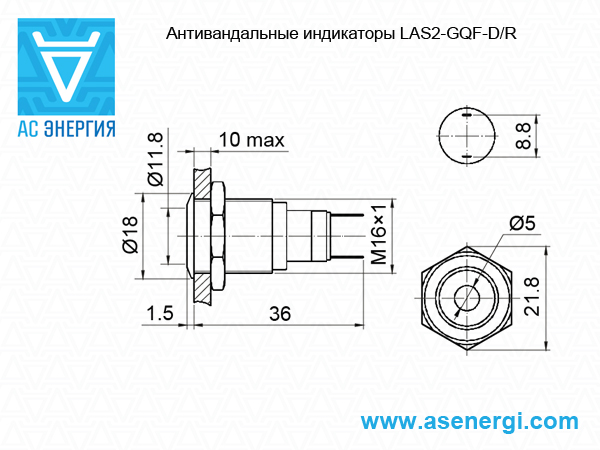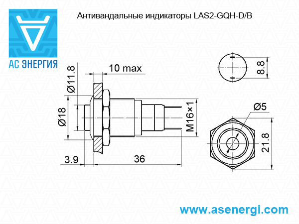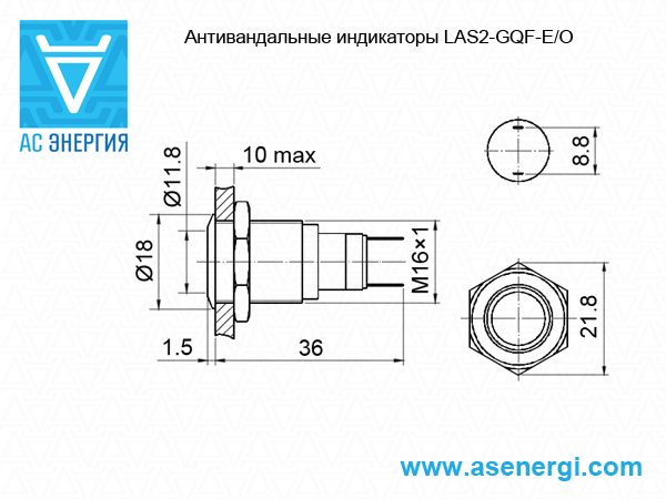 Антивандальные индикаторы LAS1, LAS2 фиксируются на панели с помощью резьбы и крепежной гайки. Посадочный диаметр – Ø16 или Ø19 мм.