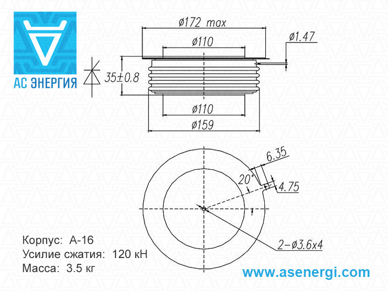 Характеристики и параметры, даташит PDF, размеры, чертёж, схема корпуса тиристора, рекомендуемые охладители указаны ниже.