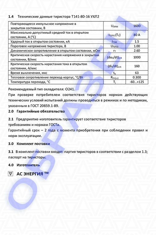Паспорт тиристор Т141-80: