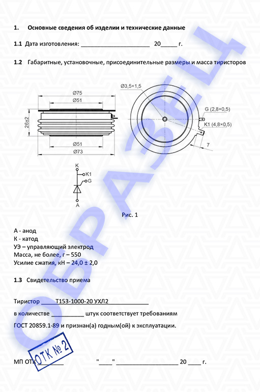 Полярность (цоколевка), размеры тиристора Т153-1000: