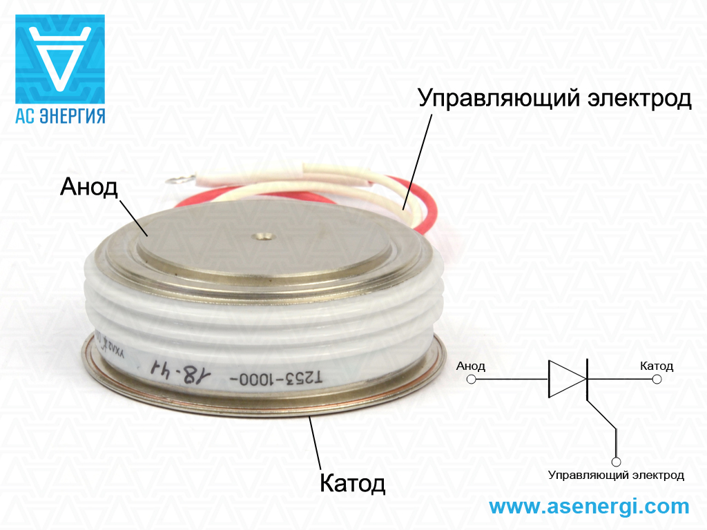 Полярность тиристора определяется по значку на корпусе. Тип корпуса тиристоров: PT53. "PT" обозначает "pill thyristor" - таблеточный тиристор.