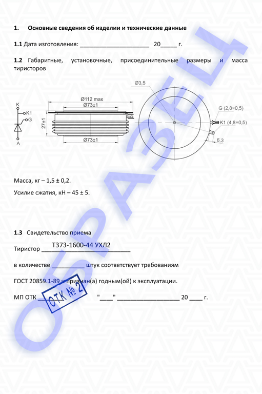 Тиристоры Т373-1600-44 – силовые низкочастотные тиристоры таблеточной конструкции общего назначения. Преобразовывают и регулируют постоянный и переменный ток до 1600 ампер частотой до 500 Гц в цепях с напряжением до 4400 В. Тип корпуса тиристоров Т373-1600-44: T.F2 – диаметр контактной поверхности – Ø73±1 мм, габаритные размеры – Ø112х27±1 мм, масса – 1,5 кг; T.F5 (РТ74) – диаметр контактной поверхности – Ø75 мм, габаритные размеры – Ø111х35±1 мм, масса, не более – 1,7 кг.