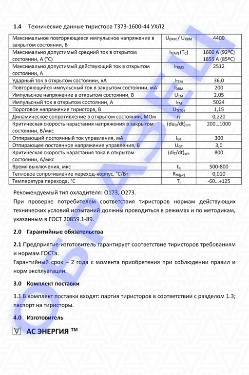 Расшифровка маркировки тиристоров Т373-1600-44 УХЛ2: