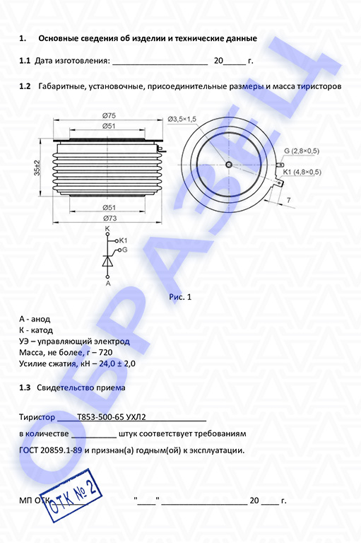 Полярность тиристора определяется по значку на корпусе. Тип корпуса тиристоров Т853-500 – PT54: диаметр контактной поверхности – Ø51 мм, габаритные размеры – Ø75х35 мм, масса, не более – 0,720 кг.