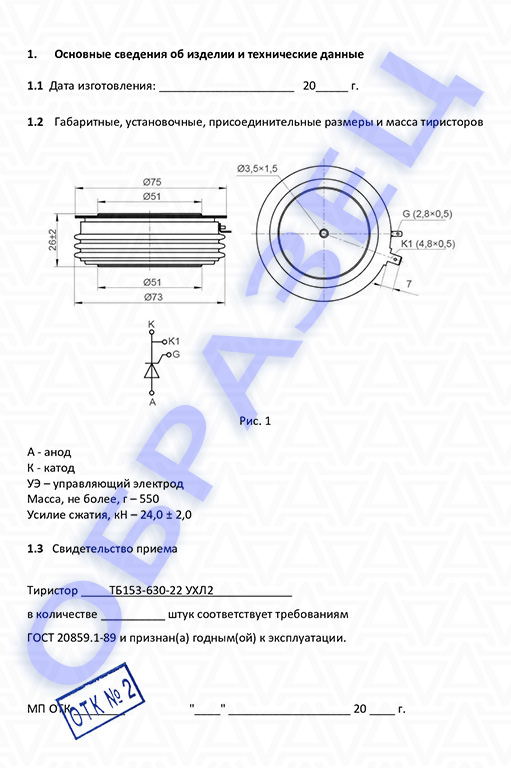 Тип корпуса тиристоров ТБ153-630 – PT53: диаметр контактной поверхности – Ø51 мм, габаритные размеры – Ø75х26 мм, масса, не более – 550 г.