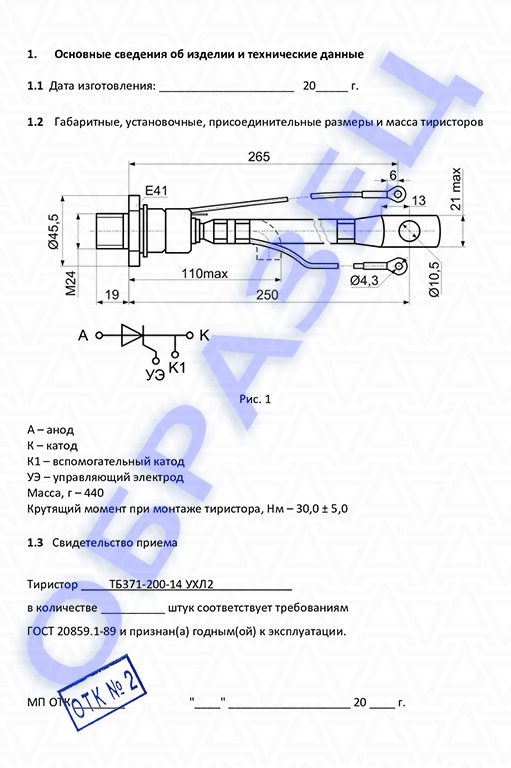 Пример для заказа тиристоров ТБ371-200: ТБ371-200-14-А2К3-УХЛ2, ТБ371-200-12-741-УХЛ2.