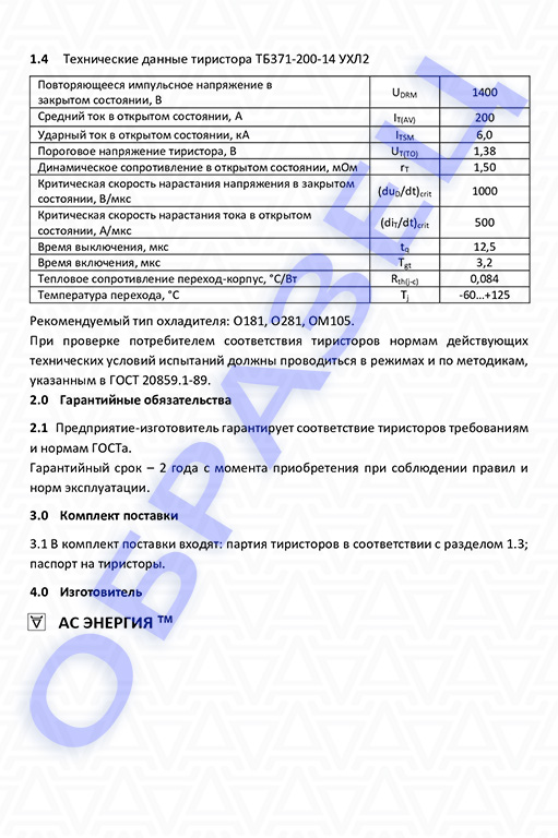 Окончательная цена на тиристоры ТБ371-200 зависит от класса, количества, сроков поставки, производителя, страны происхождения и формы оплаты.