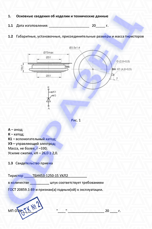 Паспорт тиристор ТБИ453-1250: