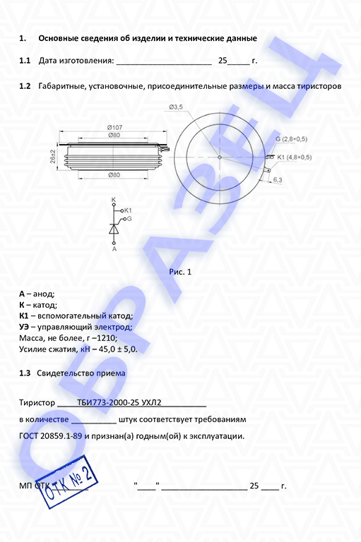 Тип корпуса тиристоров ТБИ773: T.F1 (РТ73) – диаметр контактной поверхности – Ø80 мм, габаритные размеры – Ø107х26±2 мм, масса, не более – 1210 г. Полярность тиристора определяется по значку на корпусе.