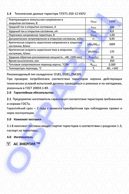 Расшифровка маркировки тиристоров ТЛ371-250 УХЛ2: