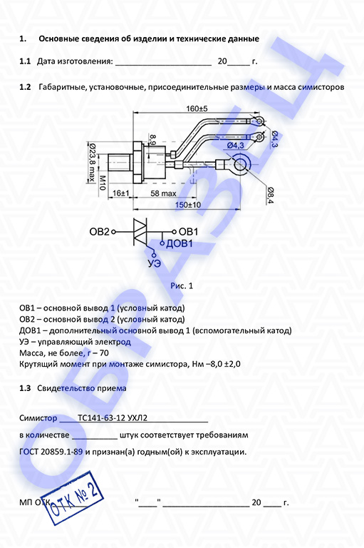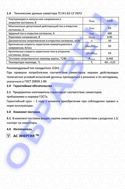 Паспорт симистор ТС141-63: