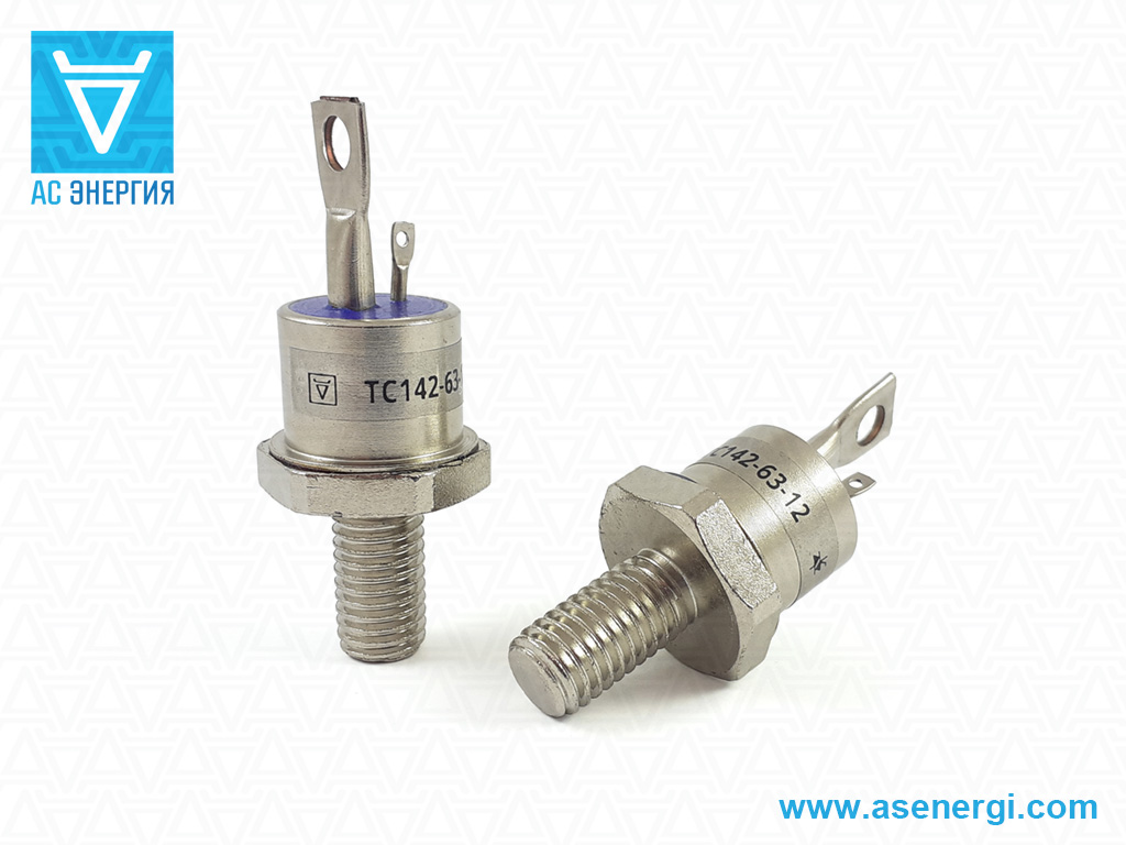 Симисторы, триаки ТС142-63 – штыревые симметричные тиристоры общего назначения, регулируют и преобразовывают постоянный и переменный ток до 63 ампер частотой до 500 Гц в цепях с напряжением 100В – 1200В (1–12кл). Тип корпуса симисторов ТС142-63 – ST4: резьба М10, масса – 50 г.