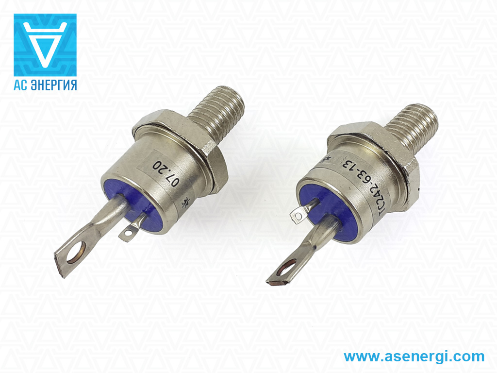 Симисторы, триаки ТС242-63 – штыревые симметричные тиристоры общего назначения, регулируют и преобразовывают постоянный и переменный ток до 63 ампер частотой до 500 Гц в цепях с напряжением 100В – 1300В (1–13кл). Тип корпуса симисторов ТС242-63 – ST4: резьба М10, масса – 50 г.