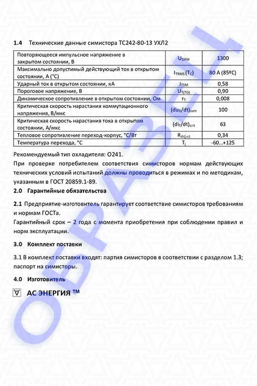 Паспорт симистор ТC242-80: