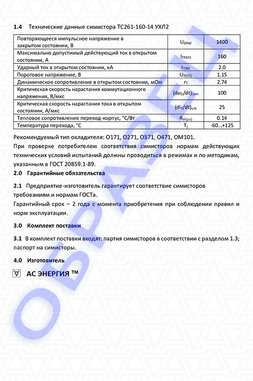 Паспорт симистор ТC261-160: